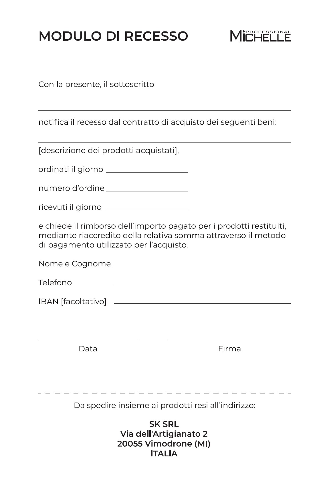 Per esercitare il diritto di recesso, il Cliente dovrà inviare al seguente indirizzo: info@michellenails.com una comunicazione contenente: